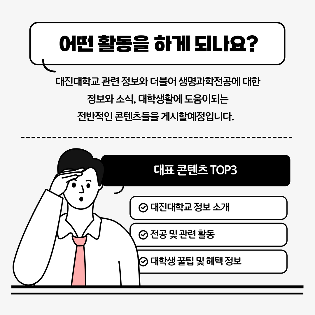 앞으로 대진대학교에 대한 전반적인 소식과 정보들부터 생명과학전공 및 대학생활에 도움이되는 여러 콘텐츠들을 알려드리려고 합니다^_____^